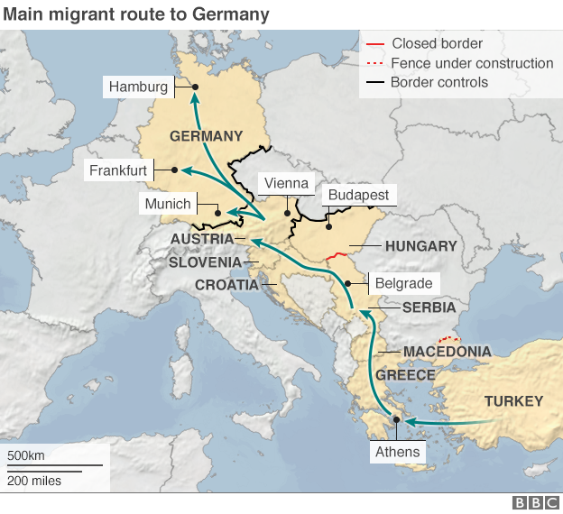 La mayor parte de los refugiados siguen la llamada ruta de los Balcanes: van desde Turquía a la isla de Lesbos en Grecia (u a otras islas cercanas a la costa turca, como Kos y Samos), cruzan Macedonia para llegar a Serbia y de ahí la mayoría sigue hacia Croacia para llegar a Eslovenia, desde donde acceden a Austria.