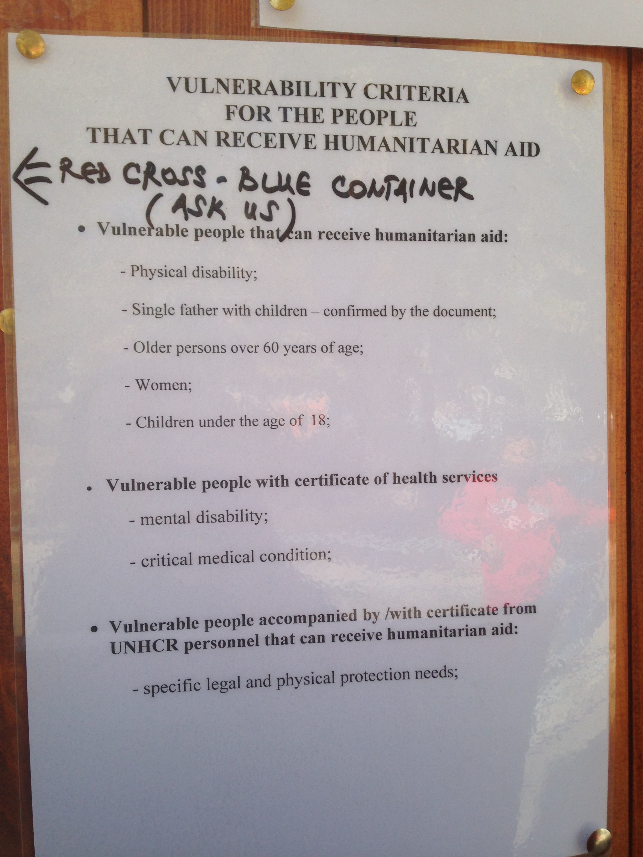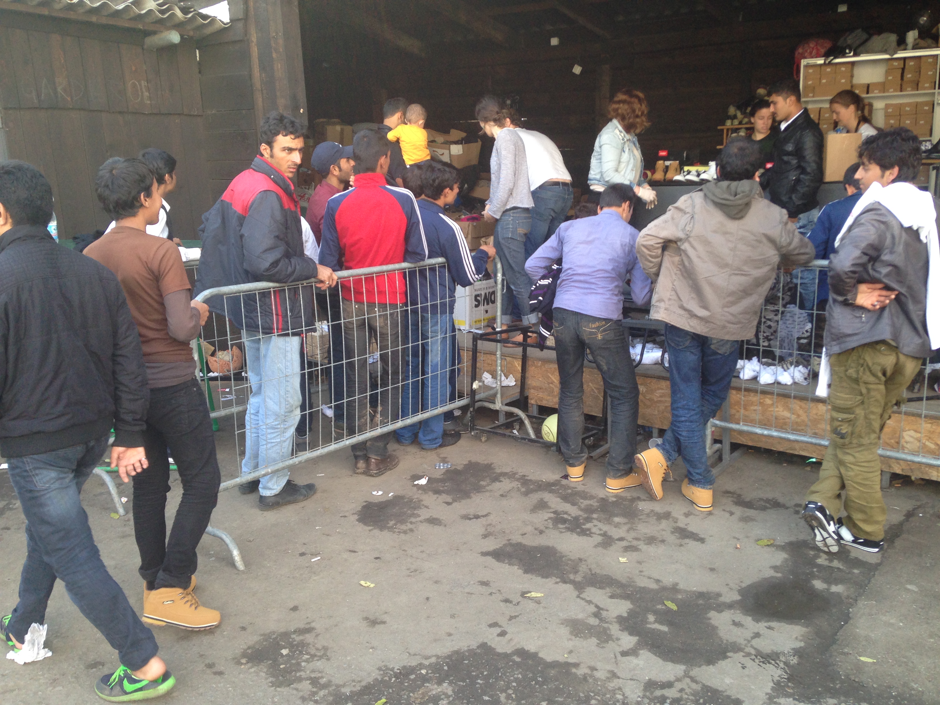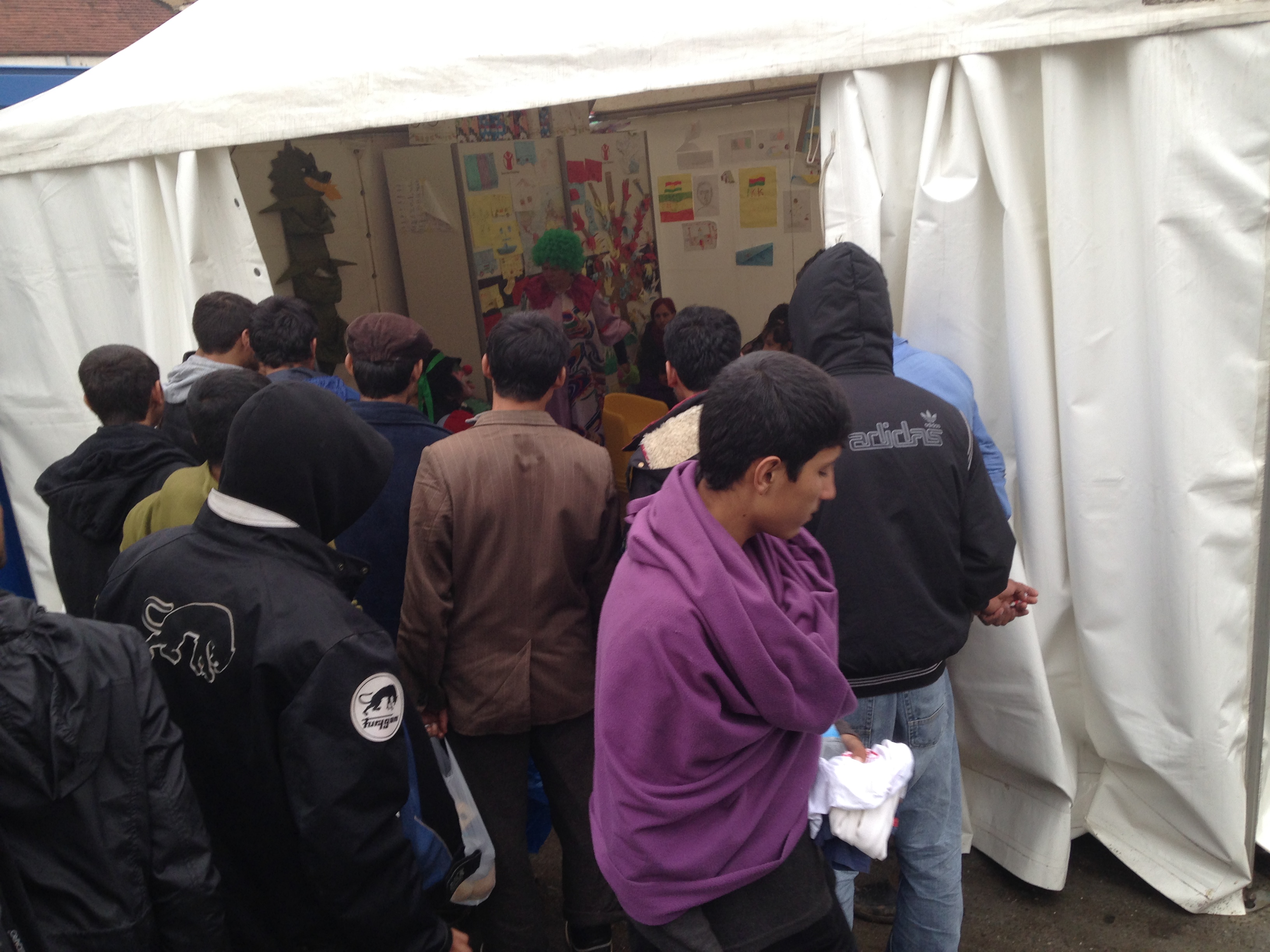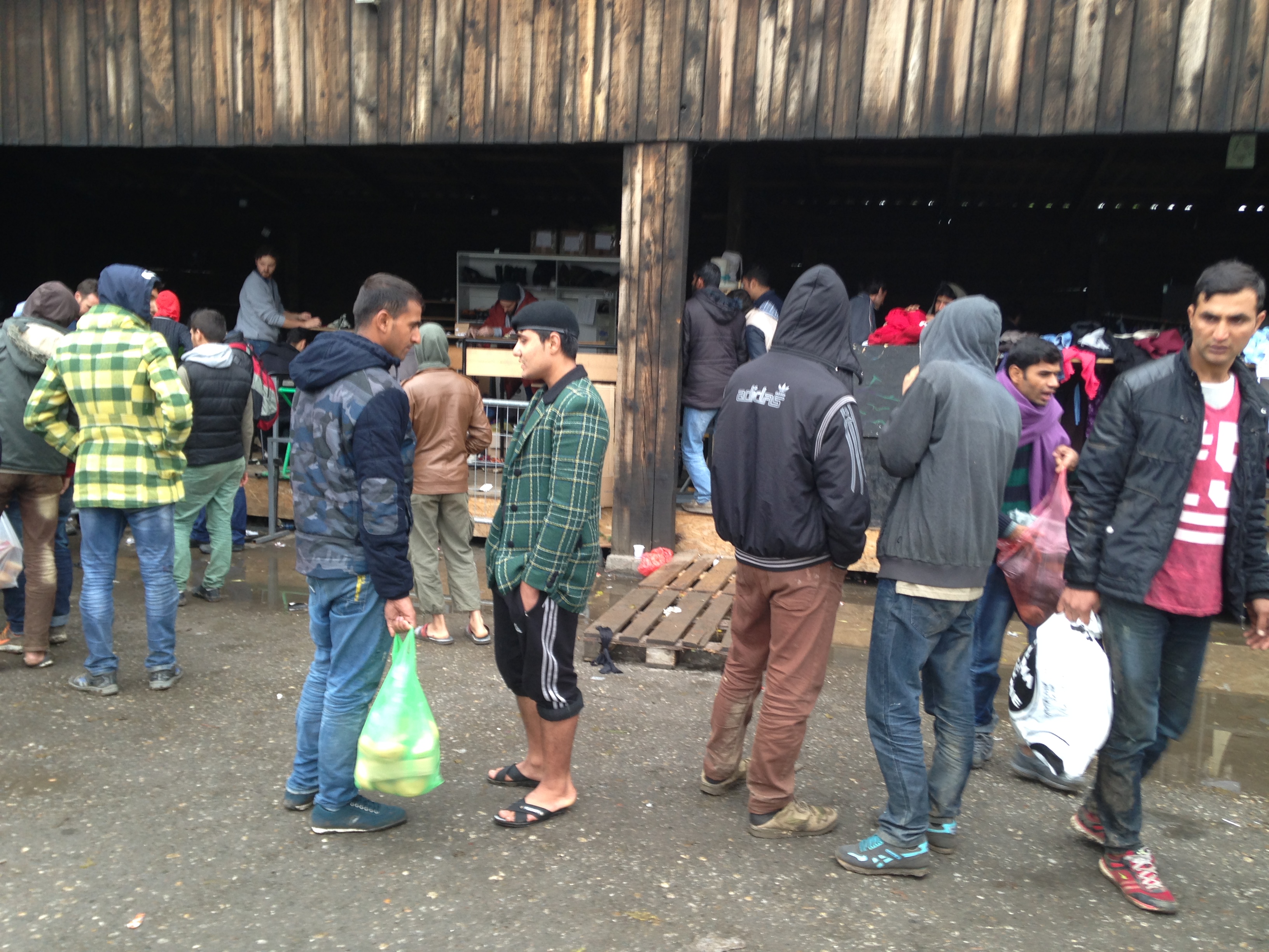 - Después de la caminata desde la frontera entre Macedonia y Serbia, a los refugiados les esperaba una cola de a veces hasta cinco horas para entrar en el campamento, luego otra cola en el interior de la carpa de Remar y Mensajeros de la Paz para un primer registro, seguida de otra cola para hacer la documentación. Todo esto lo hacían tanto de día como de noche, cargando con niños en brazos, mochilas, etc. y lo más abrigados que podían, ya que gran parte del tiempo lo pasaban al aire libre a bajas temperaturas. Por lo tanto cuando estaban en el interior de la carpa estaban demasiado abrigados, pero no tenían manos ni espacio para desabrigar a los bebés ni a ellos mismos, con lo cual algunos se morían del calor (sobre todo los que llevaban a niños en brazos) y muchos lloraban o de desplomaban. Entre esta gente también había varias mujeres embarazadas, y en las colas no había privilegios.