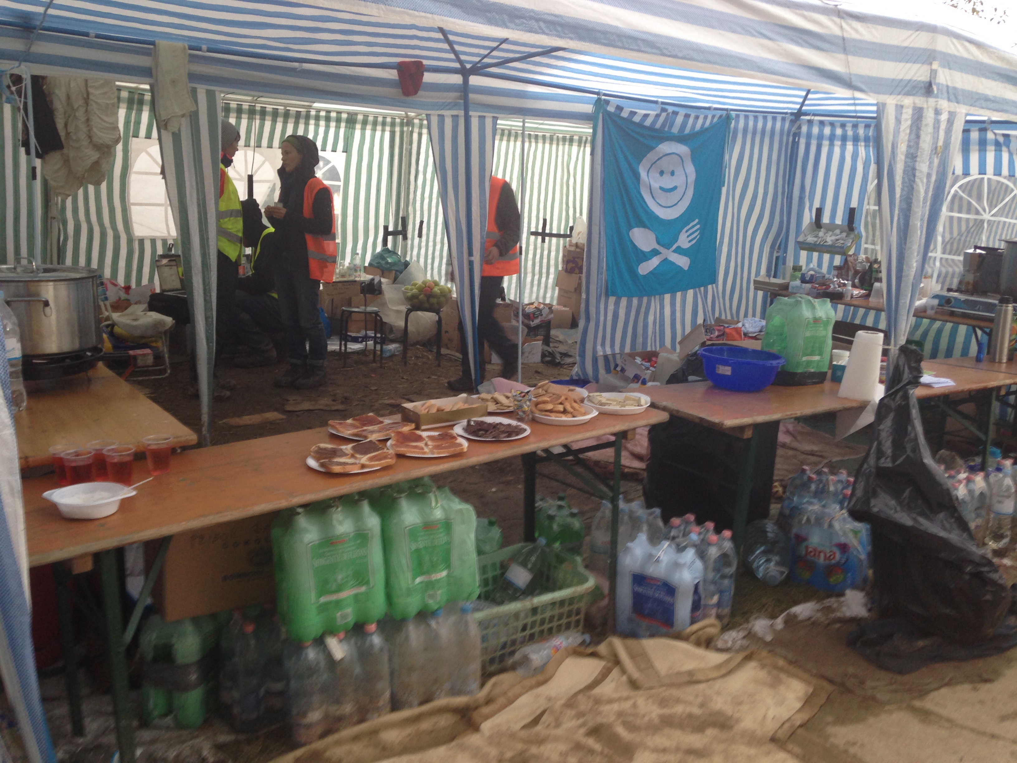 Los voluntarios también tienen que estar permanentemente controlando que la carpa esté limpia. Es una carpa de unos 200 m2 y por ahí pasan unas 2.000 personas al día, por lo que inevitablemente se ensucia rápidamente con el barro, la comida que llevan, etc. Y constantemente unos vienen y otros se van, por lo que hay que doblar mantas, mover mesas, etc. No obstante, los voluntarios siempre procuran dejar las mesas y sillas puestas hasta alrededor de las 22hrs o 23hrs, para que los que lleguen de Miratovac se puedan sentar a descansar un poco, que si no la carpa enseguida está llena de gente durmiendo en el suelo y los que van llegando no pueden pasar a hacer el registro.