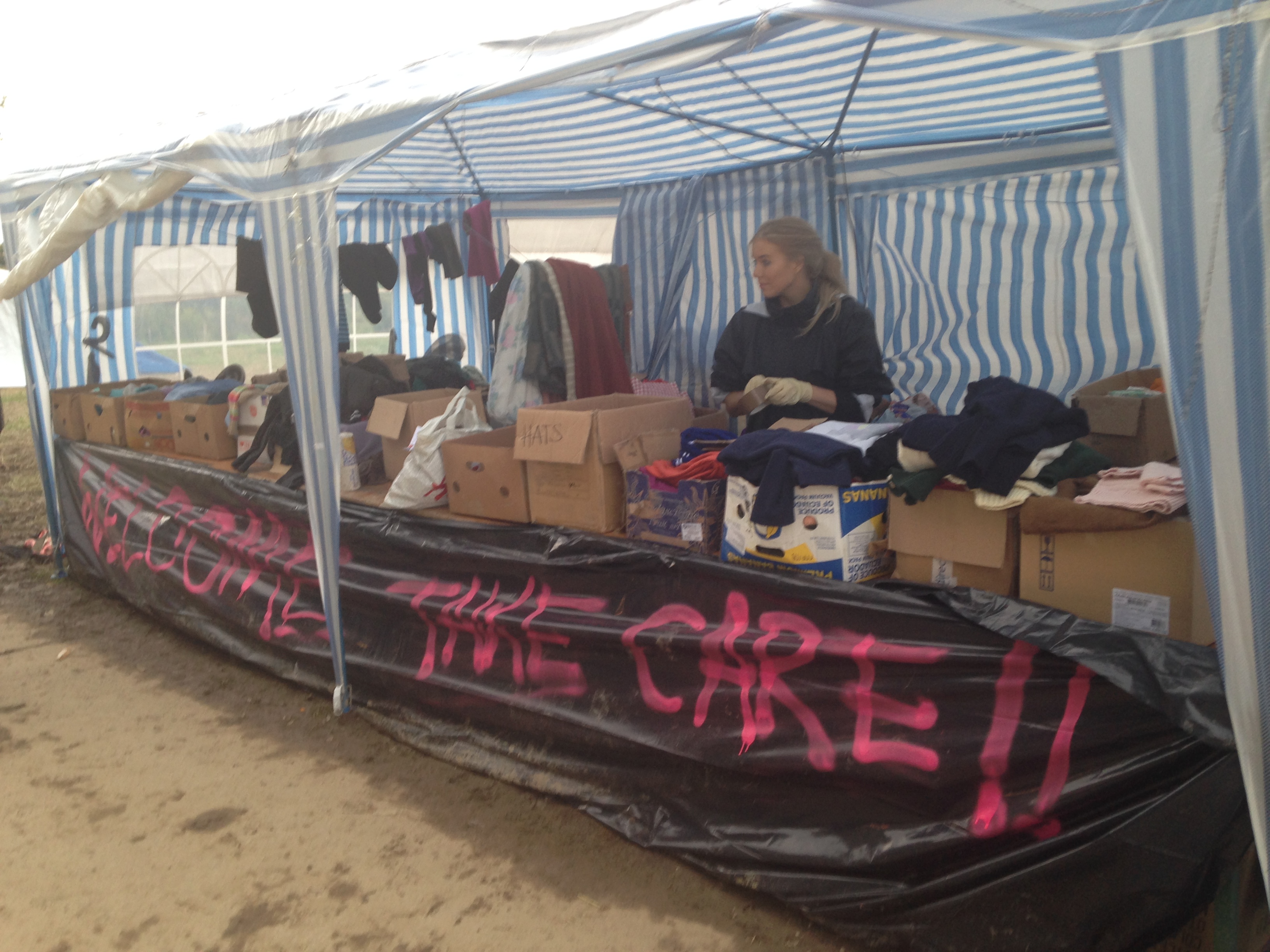 - En uno de esos momentos en que había algo de espacio en el suelo y aprovechábamos para barrer, recoger basura, doblar mantas, fregar, etc., antes de que llegara más gente a la carpa, una señora mayor sentada en el suelo con su familia hizo una señal a Bea para que se acercara a ella. Pensaba que sería para preguntarle por los horarios o precios del tren y del autobús, como solía pasar. Para su sorpresa, le cogió la cara y le plantó un beso en cada mejilla, diciendo “thank you, thank you, thank you!” Casi se le saltan las lágrimas, al ver la muestra de agradecimiento de esa persona que, estando en unas condiciones tan deprimentes y con cansancio acumulado, a pesar de todo le dedicaba una sonrisa.