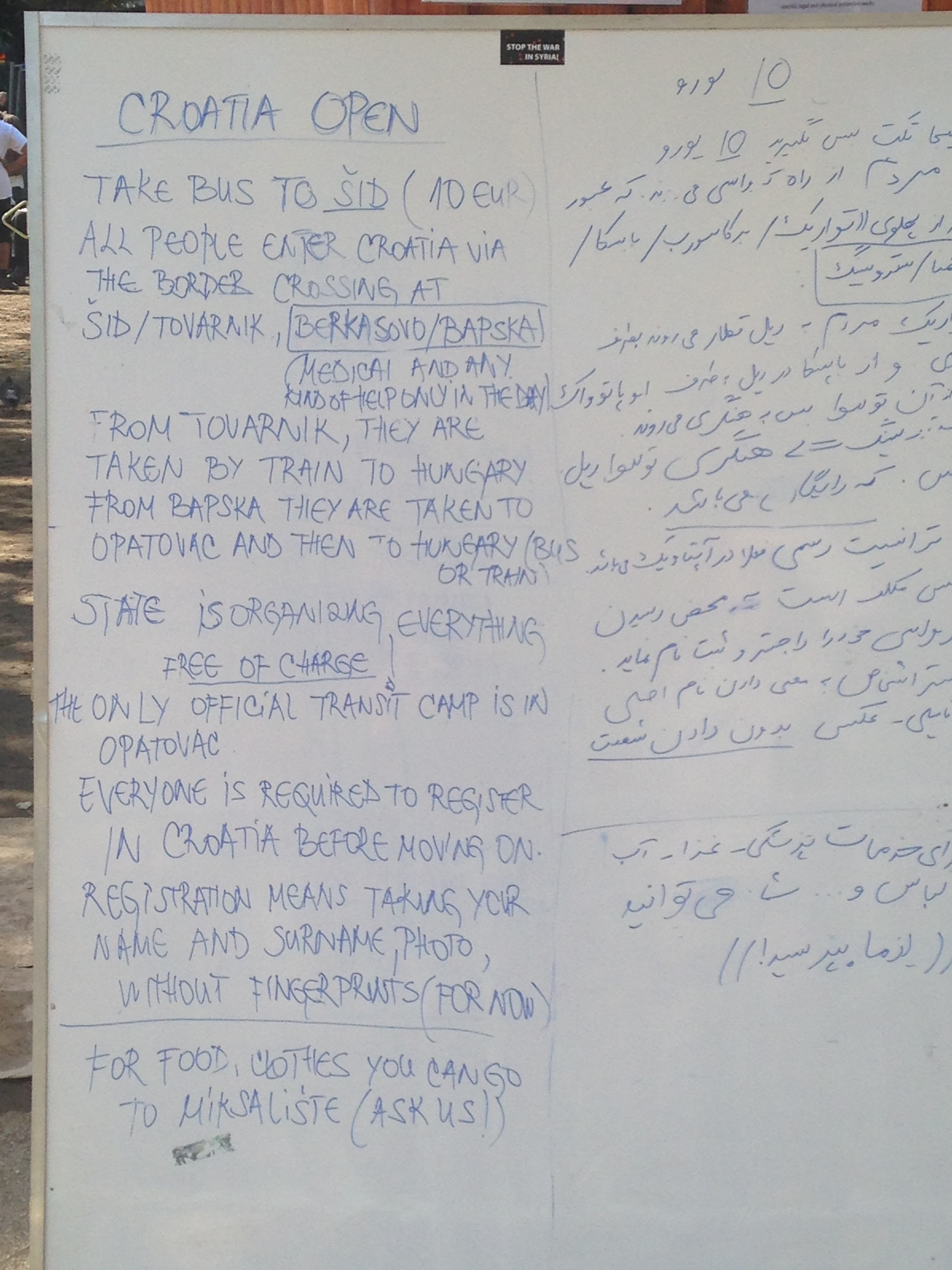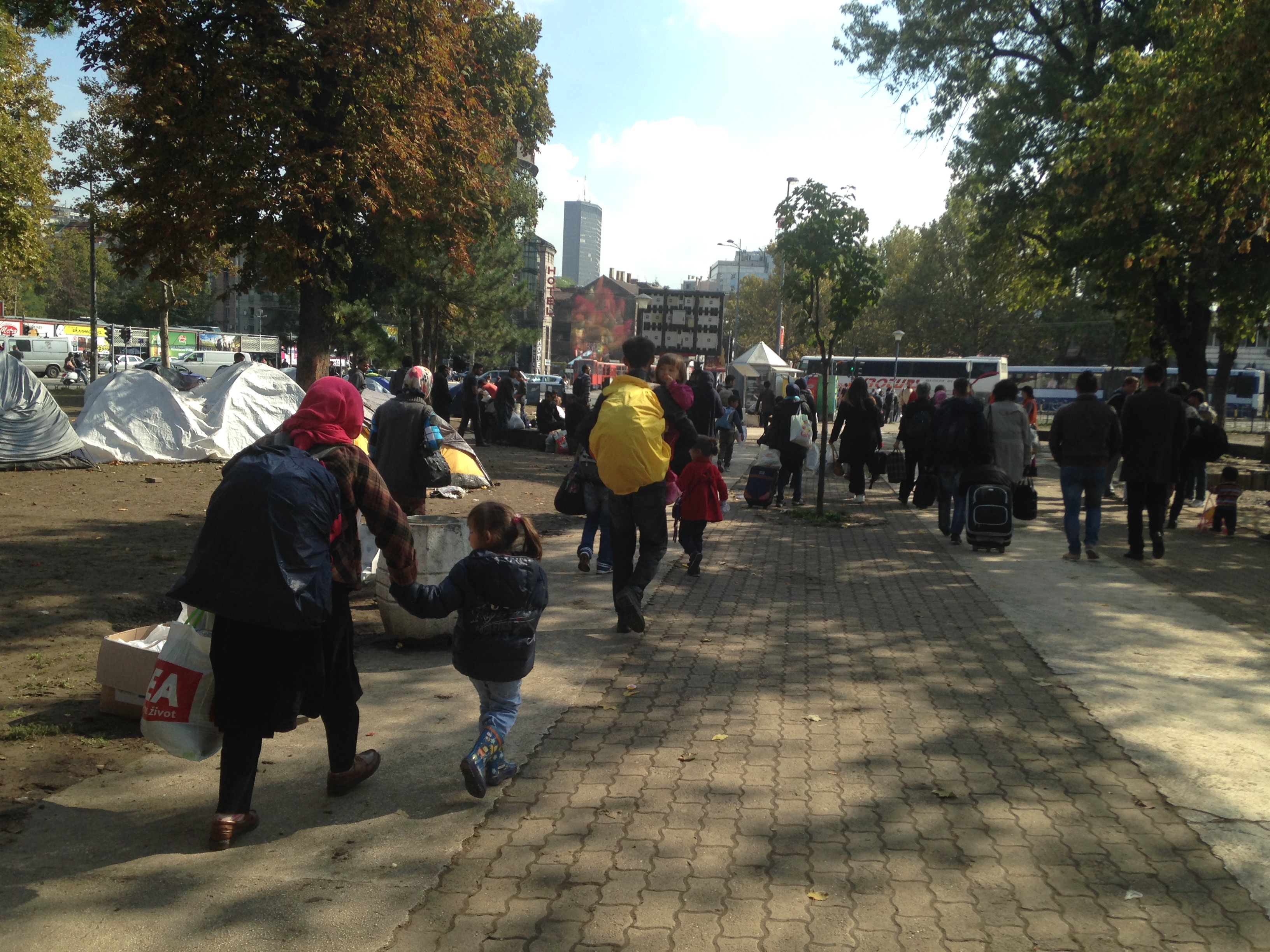 Antes de nada nos gustaría aclarar que en nuestro relato nos vamos a referir a estas personas como ‘refugiados’ en lugar de ‘inmigrantes’. Entendemos que no se les puede considerar como ‘refugiados’ hasta que no completen el proceso legal de solicitud de asilo y también somos conscientes de que hay personas que han entrado en Europa huyendo de la pobreza y no de la guerra. En estos momentos el control de entrada es mucho mayor que hace unos meses puesto que ya sólo pueden entrar personas con pasaporte sirio, afgano o iraquí que probablemente reciban la condición legal de ‘refugiado’. Además, las personas que hemos conocido en Presevo no nos ha parecido que vinieran buscando un trabajo mejor sino más bien lo contrario, dejan trabajos y vidas acomodadas para buscar una vida fuera de peligro para sus hijos pero incierta en cuanto a trabajo y condiciones económicas.