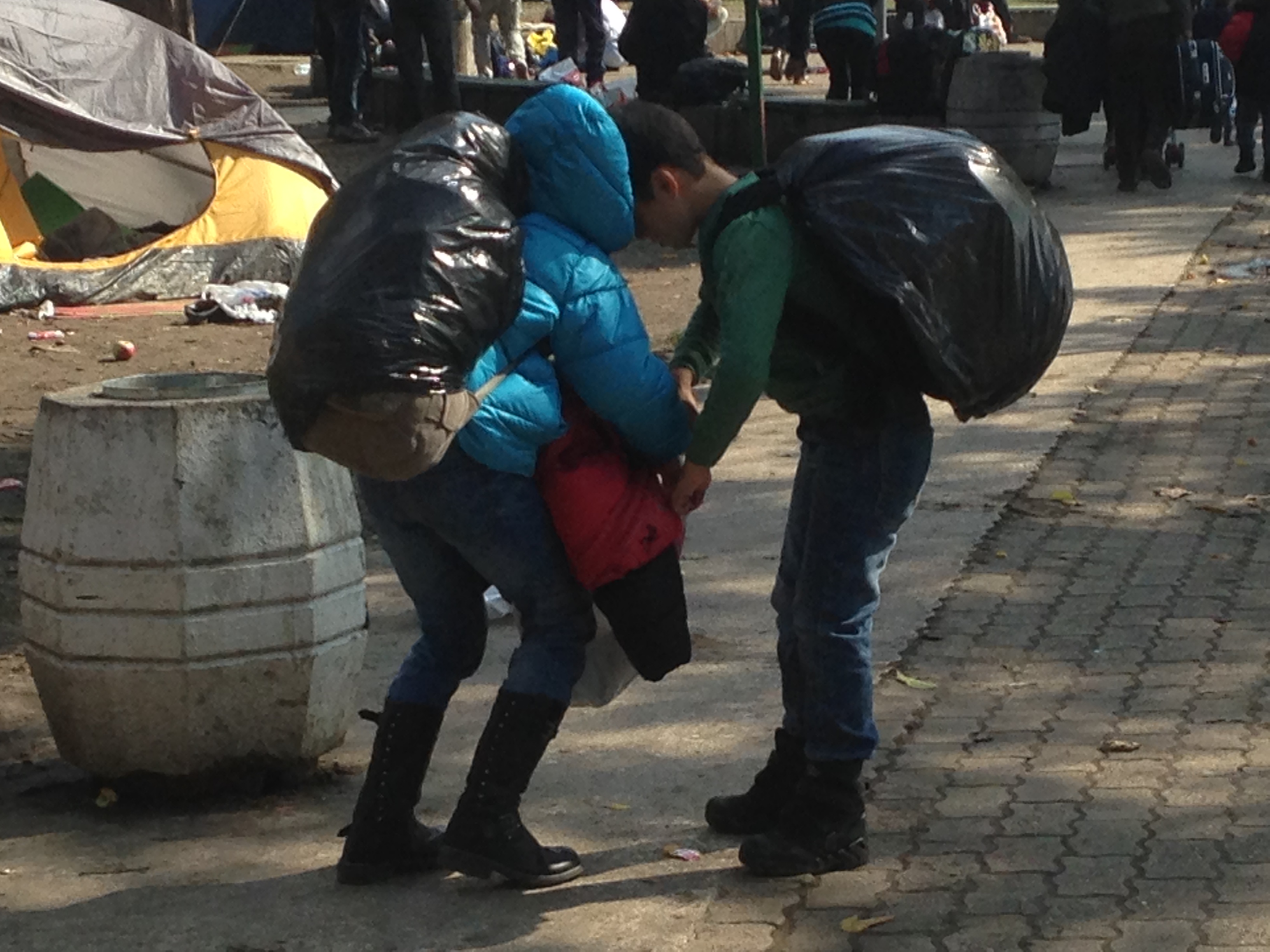 - Sarah y sus sobrinos. Sarah es una chica iraquí de unos 20 años que viaja con su cuñada y sus sobrinos. Nos llamaron la atención los niños porque eran de edades muy parecidas a nuestros hijos. Estaban hambrientos y agotados. El pequeño, de 5 años, no tardó en desfallecer de cansancio, así que le tapamos con una manta y le pusimos una mochila bajo la cabeza. Muy pronto sus dos hermanos siguieron su camino, y nos dejaron a cargo de los tres mientras Sarah y su cuñada se marchaban a hacer los papeles. Eran las 11 de la noche y habían estado caminado durante más de 6 kms para cruzar la frontera de Macedonia y Serbia y llegar al campamento. Como todos los demás, venían cargadísimos, y llegaron agotados. Después de hacer más de una hora de cola, Sarah y su cuñada volvieron llorando porque la policía no quería arreglarles los papeles sin ver a los niños. Así que había que despertarles, y aquello era imposible. Estaban tan cansados que no podían abrir los ojos, y mucho menos aguantar de pie despiertos la cola de una hora para hacer de nuevo los papeles. Así que fuimos a buscar a un médico del campamento para pedirle que llevara a los niños directamente a la policía, sin esperar cola, porque los pobres estaban literalmente exhaustos y no podían levantarse. Los levantamos entre todos y se los llevaron como pudieron. Luego volvió Sarah a darnos las gracias por nuestra ayuda. Y vino otra vez al día siguiente, y esta vez nos contó su historia. Estaba huyendo de Irak porque su familia la había repudiado al suponer que había tenido una aventura con su profesor. Sarah les aseguró que no era cierto, pero no la creyeron. La encerraron en su habitación durante 58 días y sólo le permitían una comida al día. No la dejaron continuar sus estudios y empezaron a hacerle la vida imposible. Decidió abandonar Irak y abandonar a su familia para buscar un futuro mejor. Y escapó con su cuñada y sus sobrinos para reunirse con su hermano en Austria.