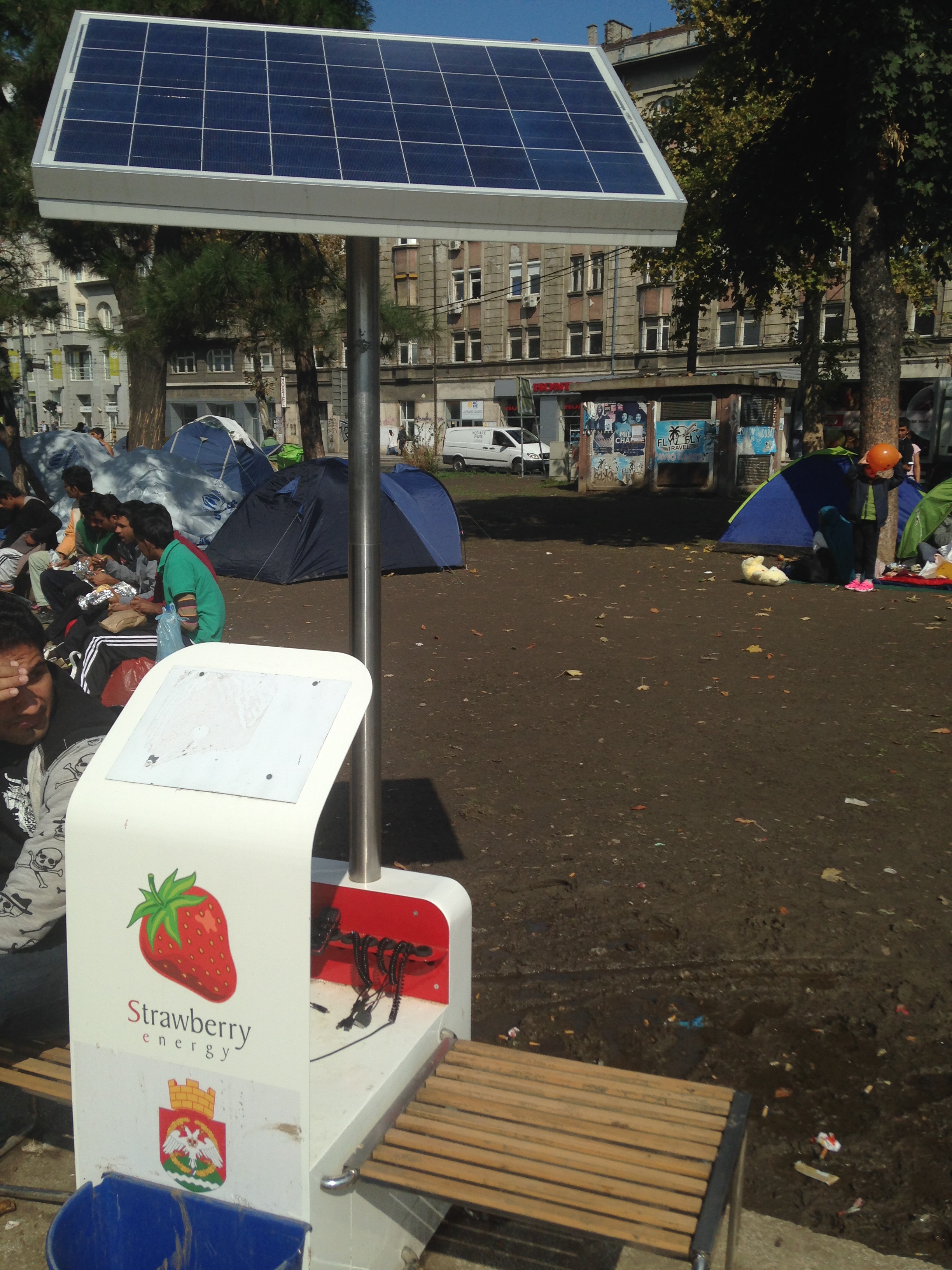 En la carpa los refugiados también tienen enchufes para cargar sus móviles, que es la manera de ponerse al día con sus familiares. Es un momento donde se pueden sentar y aprovechar el wifi y los enchufes para comunicarse. La red de wifi está instalada por Télécoms Sans Frontiers.
